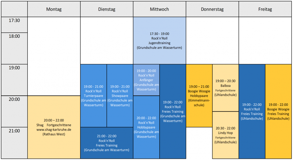 Das Boogie Woogie Training der Hobbypaare findet donnerstags zwischen 19:00 und 20:30 in der Uhlandhalle statt. Informationen zum Anfänger- und zum Fortgeschrittenen-Training im Boogie Woogie gibt es bei Stefan.
